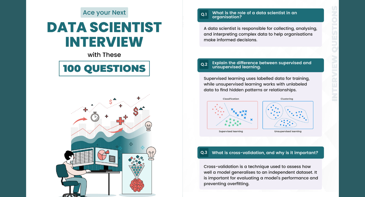 The Data Scientist Important Interview Questions & Answers PDF is a professionally curated guide containing 100 must-know questions covering all the essential areas of data science. The document includes both fundamental and advanced topics such as: