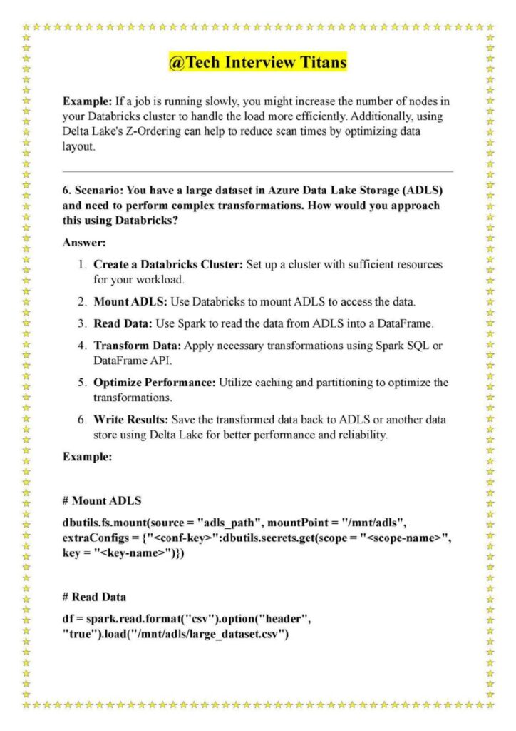 Realistic scenarios such as transforming large datasets in Azure Data Lake Storage (ADLS), merging datasets with different schemas, handling memory failures, and optimizing slow Spark jobs.