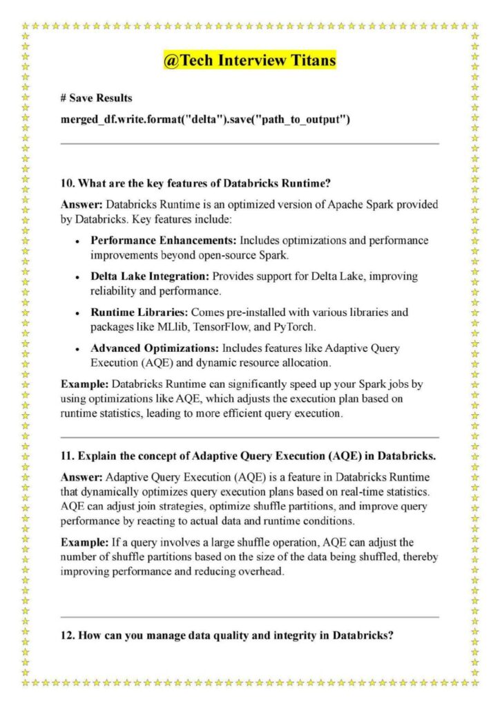 Based on the content of the PDF, it covers essential Databricks concepts such as Apache Spark integration, Delta Lake, Databricks Runtime, Adaptive Query Execution (AQE), batch and streaming processing, cluster management, and data governance . The questions are written in a straightforward format that mirrors real technical interview discussions.