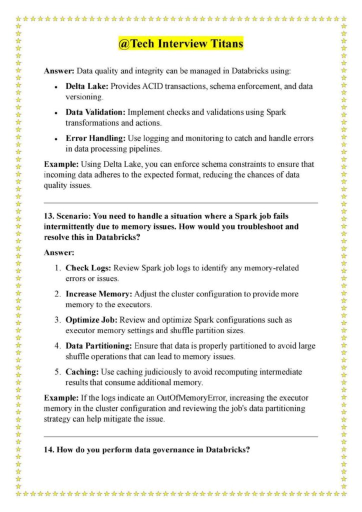 Instead of overwhelming readers with theory, the document focuses on how Databricks works in production environments and how candidates should explain their decisions during interviews. This makes it especially useful for professionals preparing for mid-level and senior roles.